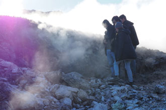 | Am Samstag fuhren wir nach Larderello, das weit über die Grenzen Italiens hinaus als Zentrum der Geothermie gilt. Hier lernten wir, wieder einmal geführt von Christa, wie die Beschaffenheit des Untergrundes aussieht, die notwendig ist für das Phänomen der in der Erde eingeschlossenen heißen Gase, die in der Gegend um Larderello zur Herstellung von 100% grünem Strom verwendet wird. Besonders eindrucksvoll wurde es, als für uns ein ehemaliges, nicht mehr verwendetes Ventil geöffnet wurde, aus dem schlagartig eine Dampfwolke heißen Gases mit ca. 130db entwich. Tief beeindruckt von dieser Naturgewalt machten wir am Ende des Ausflugs noch eine Wanderung durch eine Gegend, in der die eingeschlossenen Gase natürlich an die Oberfläche kommen. Kochend heiß und durch den Schwefelbeisatz gefährlich sauer wurde hier die die gesamte Umgebung über viele Jahre verändert, schwarzes Jaspis wurde weißlich und der eigentlich gelbe Sandstein wurde durch Eisenoxidablagerungen rötlich - alles in allem, ein wirklich interessanter Tag! |